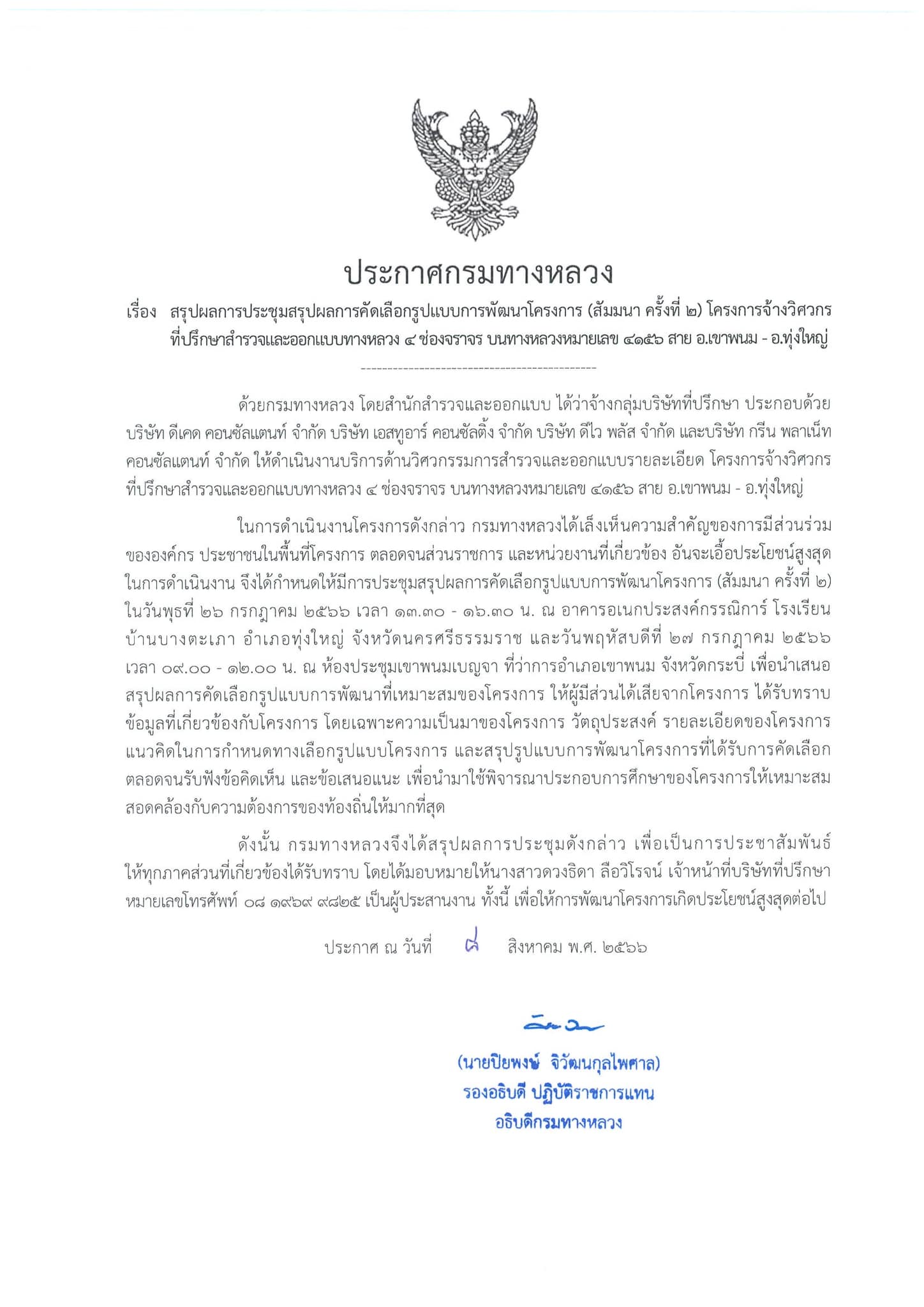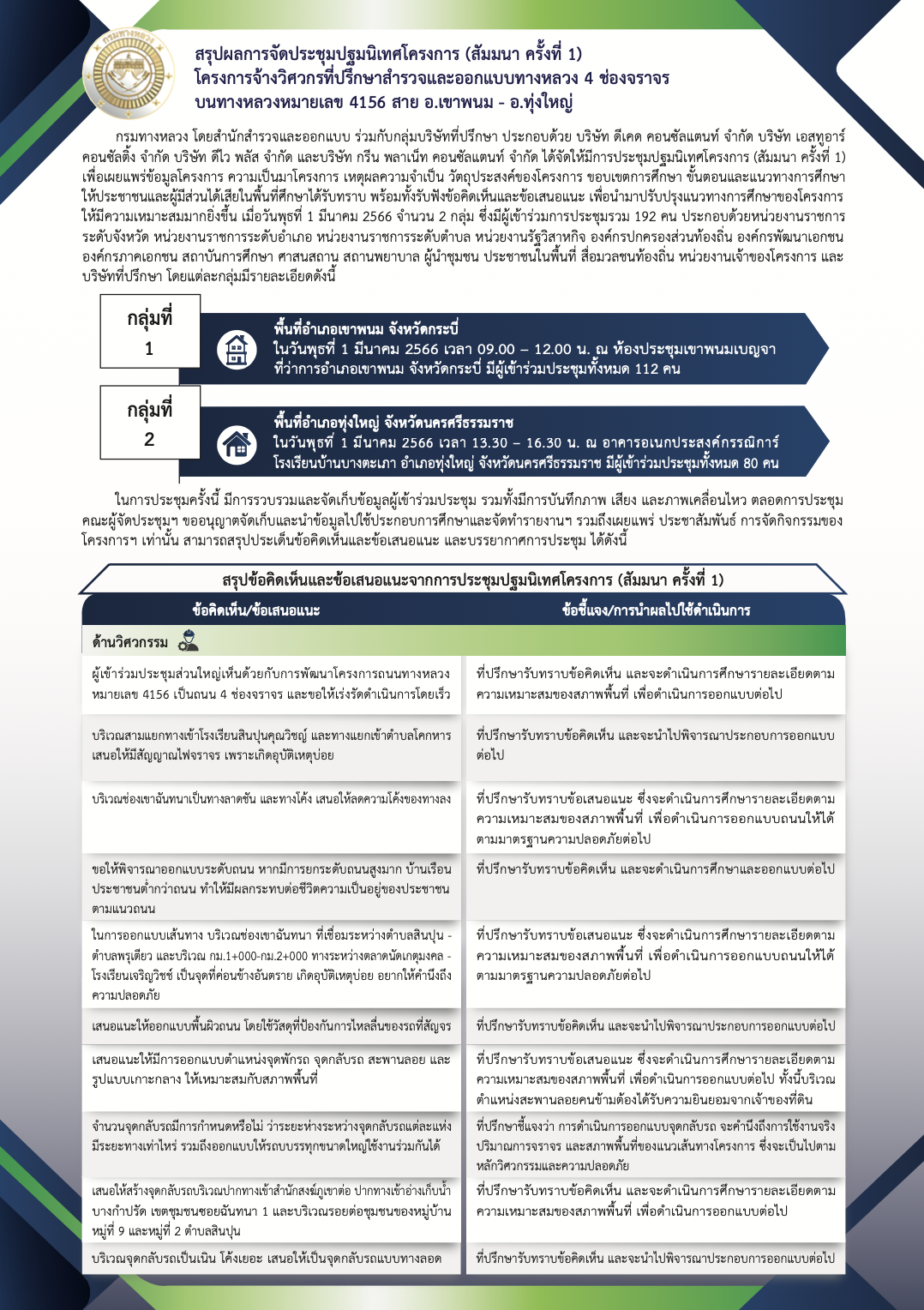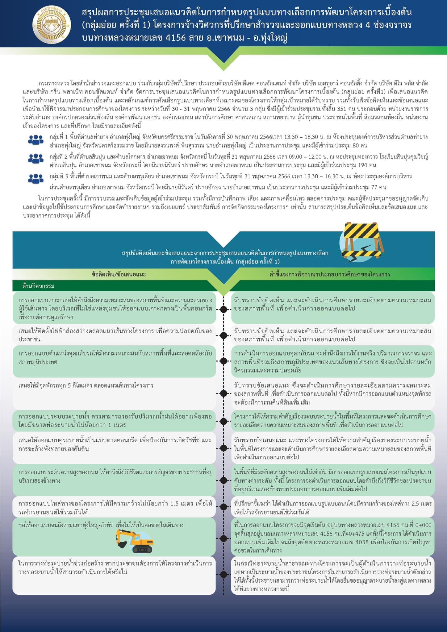 ตามที่สำนักสำรวจและออกแบบ กรมทางหลวง จัดการประชุมเสนอแนวคิดในการกำหนดรูปแบบทางเลือกการพัฒนาโครงการเบื้องต้น (กลุ่มย่อย ครั้งที่ 1)